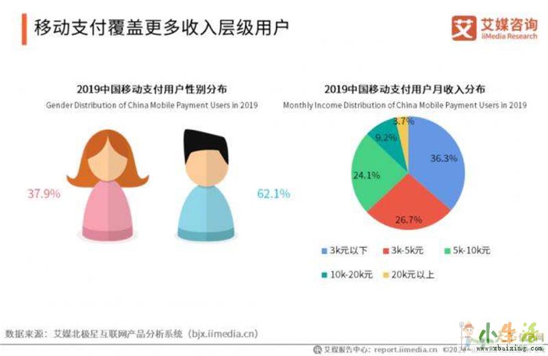 数据显示,移动支付用户以男性为主,占比62.1%x.b.a.i.x.i.n.g.c.o.m。收入方面,移动支付对于月收入10000元以下用户覆盖更高,特别是月收入3000元以下用户占比36.3%。
