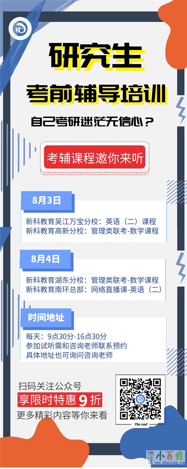 内容:对于大多数人来说,人生中只有两次改变命运的机会,第一次是高考,第二次是考研,如果你的第一次没有把握住,没有去一个可以享受到更好的教育资源的学校,那么,新科在这里,陪你一起把握住第二次机会