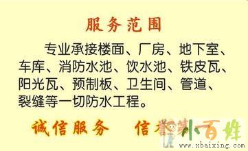 公司承接 楼房、平房、屋面、阳台、天沟、地下室、水池、卫生间、钢结构、游泳池、车库、女儿墙、专业工厂、宿舍楼、公寓、花园小区、外墙防水补漏、室内外防潮、高压注浆、等防水补漏工程...