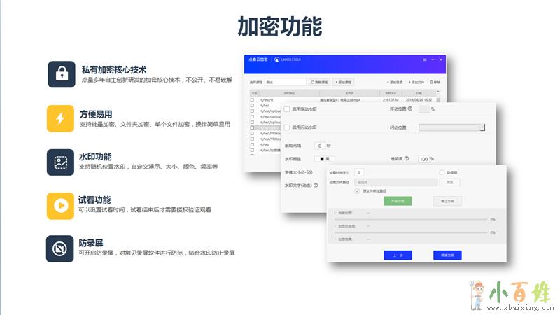 而对于商家来说加密工具还必须要有的就是防录屏功能,这个是目前破jie加密视频常见的方法,而且成本很低。点盾云加密系统也具备该功能,对于常见的录屏软件可以防止软件方式的录屏。但是对于这个问题不能一概而论,因为想要实现录屏总是有方法的,绝对的录屏没有任何一款产品可以做到,比如简单的用手机或者摄像机录制www.xbaixing.com小百姓网。但是这种方式的视频一看就有问题,比如清晰度、含有水印等。这里水印的作用就显示出来了。虽然追求产品的完美性是用户想要的,但实际中也要看其从技术上实现的可能性。