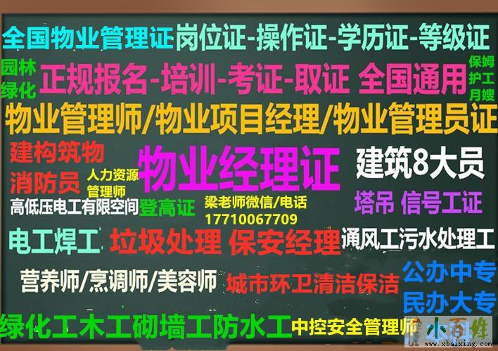 全国在线报名咨询物业管理证,消防证,保安证,监理证,八大员证,环卫证,保洁证,清洁证,园长证,幼儿教师中式西式面点师烹调师,花卉工www.xbaixing.com