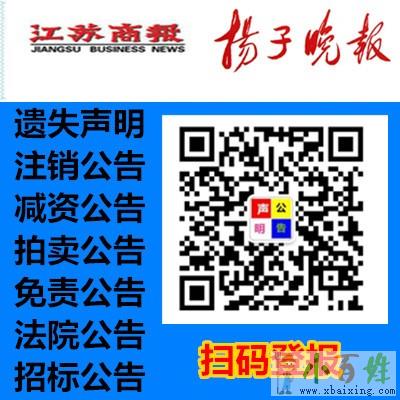 扬子晚报,登报遗失声明要多少费用,怎么登报办理?求知情者告知专业报纸遗失公告、声明公告、分类公告等项目www.xbaixing.com。