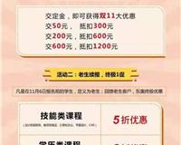 迎双十一,提前预热啦!针对新学员,东奥教育特推出以下活动:针对所有课程,预付抵扣活动交50抵300200抵600600抵1200想提升学历和考证的伙伴一定要抓住机会啦,一年仅一次特大优惠,活动时间 11.6-11.12号逾期活动作废..